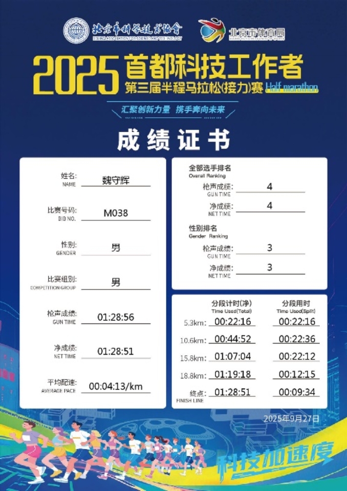 金秋九月,美景如画。9月27日,2025首都科技工作者第三届半程马拉松接力赛和个人赛在怀柔科学城举办。植保所魏守辉研究员获得男子半程马拉松个人赛第三名,植保神农战队获得半程马拉松接力赛第二十八名。