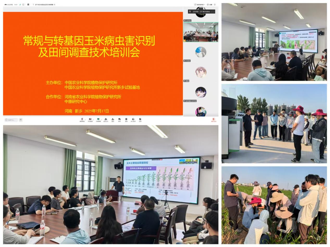 为有效应对玉米病虫害挑战,服务转基因玉米产业化对植保技术的新需求,并着力提升玉米病虫害防控领域研究生的专业素养与实战技能,中国农业科学院植物保护研究所粮食作物害虫监测与控制创新团队联合新乡科研试验基地,于2025年7月17日在新乡成功举办了“常规与转基因玉米病虫害识别及田间调查技术培训会”。研究所所区、廊坊基地、新乡基地及中原研究中心师生共计70余人线上线下参会。