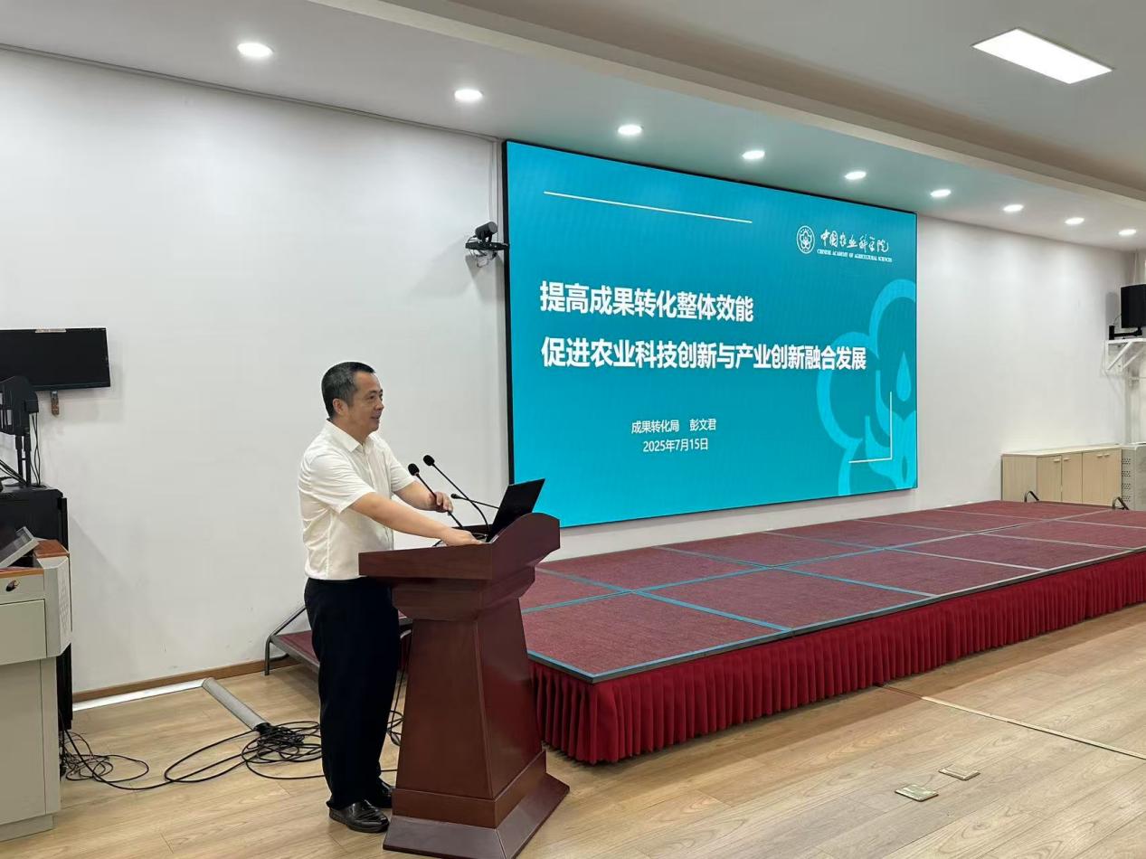 中国农业科学院成果转化局局长彭文君与会并围绕成果转化“转什么?哪里来?转给谁?怎么转?谁来转?”做了具体指导,同时介绍了成果转化的典型模式。作物科学研究所李少昆研究员分享了“玉米密植精准调控高产技术”的产业实践,团队聚焦产量潜力突破与资源高效利用,构建了现代高产高效生产技术体系,为粮油作物单产提升提供了重要支撑。农产品加工研究所平台与基地处副处长司智陟分享了“深化所地合作”的鲜活经验。