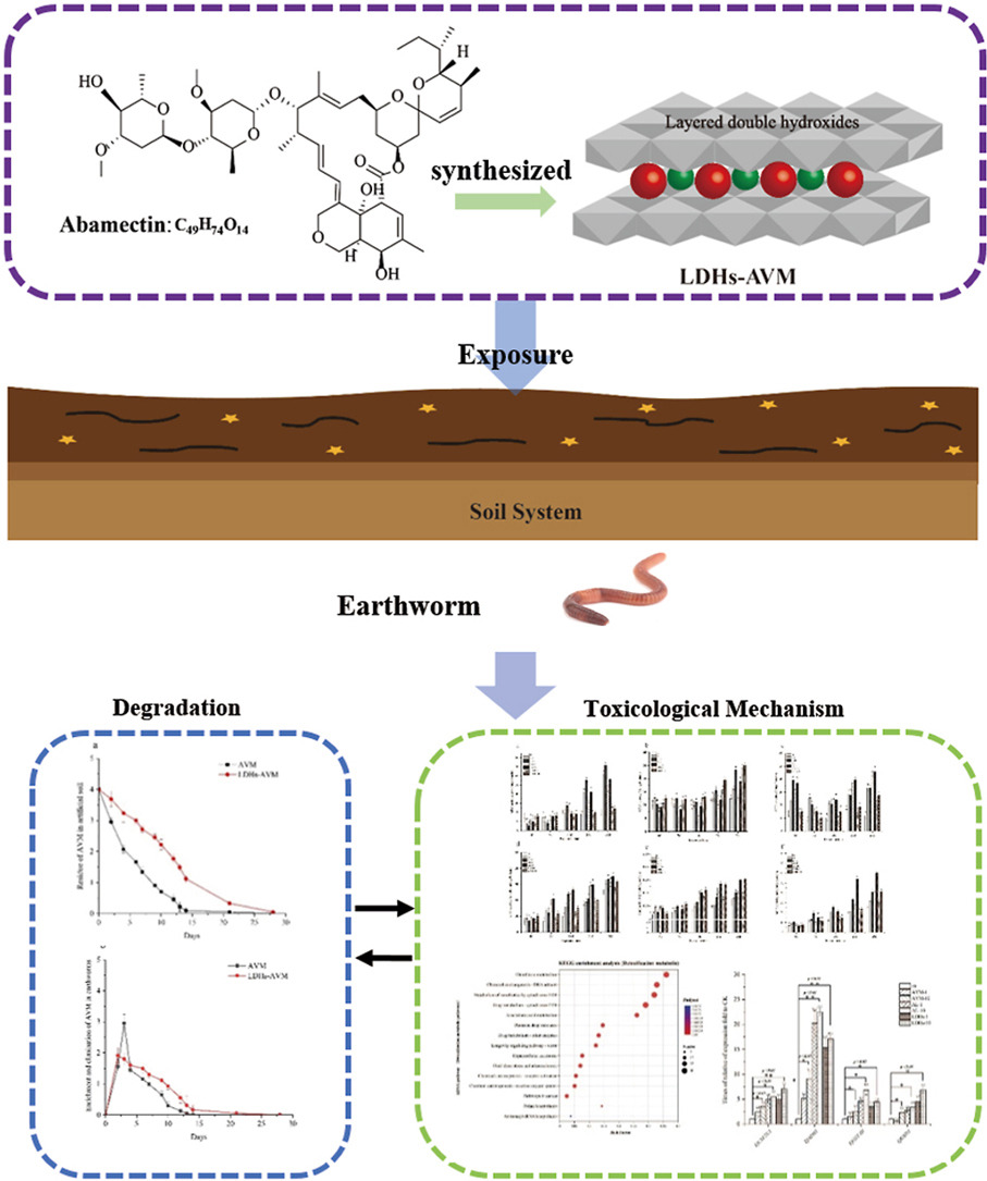纳米农药在增强生物活性及减少用量方面优势突出,然而,其对非靶标生物的生态安全风险是公众重要关注点。本研究以土壤非靶标生物蚯蚓为对象,系统评估了阿维菌素负载型ldhs纳米农药(ldhs-avm)在土壤中的释放行为、生物积累特征及其对蚯蚓生理和分子水平的影响。结果显示,阿维菌素原药相比,ldhs-avm在土壤中的消解速率降低了2.9倍,具备更持久的控释性能;蚯蚓体内有效成分积累量减少35%,显著降低了暴露风险。纳米载体ldhs可显著激活蚯蚓的抗氧化和解毒系统,相关解毒基因(如cyp2e1与gsh合成通路)表达量提升2.8至22.5倍,蚯蚓体内丙二醛含量明显降低,脂质过氧化水平下降,显著降低了阿维菌素对蚯蚓的毒性作用。该研究为高效低风险农药的开发提供了新思路,通过控释技术减少施药频次,并协同激活非靶标生物的内源性解毒机制,为土壤生态安全提供理论依据。