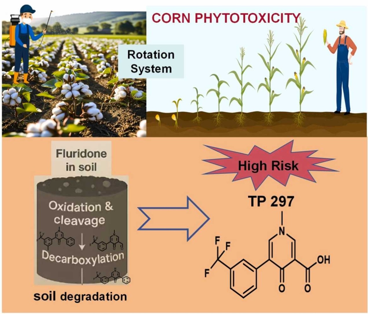 氟啶草酮是仅登记于我国棉田防治龙葵的一种选择性除草剂,因其在土壤中持久性强并对后茬作物造成药害而备受关注。然而,现有研究主要聚焦于母体化合物,对其在土壤中的转化产物及潜在药害风险认识不足。本研究利用高分辨质谱非靶向筛查策略结合分子对接和分子动力学模拟技术,系统解析了氟啶草酮在新疆农田土壤中的降解路径,明确其土壤半衰期为39.6–89.5天,并识别出一种具有潜在植物毒性的转化产物tp297。结果表明:tp297与类胡萝卜素合成关键酶pds的结合能(−26.57 kcal/mol)甚至优于母体氟啶草酮(−23.15 kcal/mol),盆栽实验证实了氟啶草酮和tp297能破坏玉米叶片叶绿体结构、抑制光系统ii功能,导致光合作用受损造成的毒性效应,表现出“隐性”药害风险。研究结果强调了除草剂土壤转化产物纳入环境风险评估及植物安全性评价的必要性。