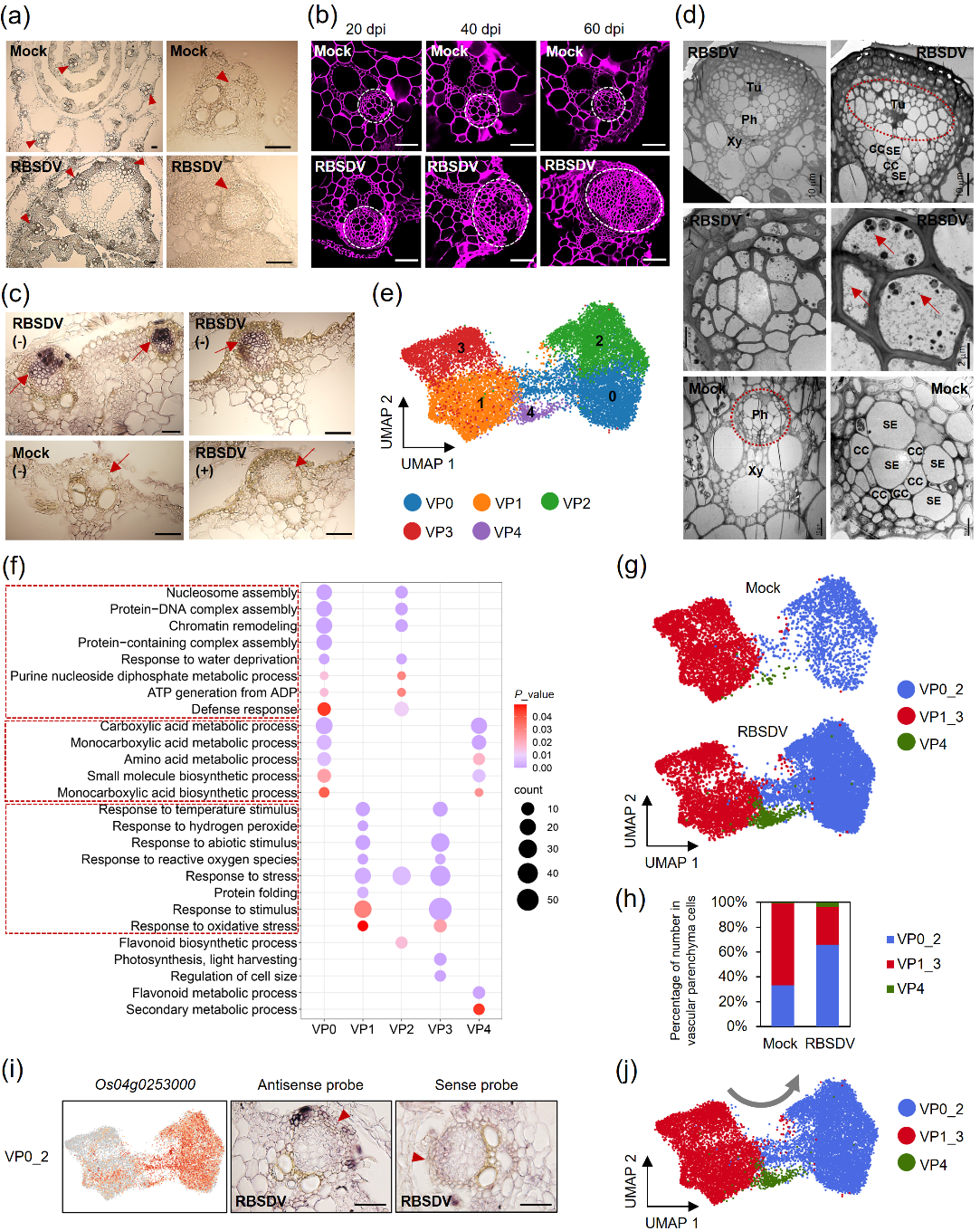 本研究通过单细胞转录组测序技术对感染和未感染rbsdv的水稻叶鞘进行分析,绘制了含有12种细胞类型的水稻叶鞘单细胞转录图谱。在感染rbsdv后,水稻叶鞘中薄壁细胞和维管组织薄壁细胞的变化最大,主要表现为细胞数目的增加和差异表达基因数量的增加。进一步研究发现感染rbsdv的水稻维管组织细胞沿着韧皮部向外扩张,并形成肿瘤细胞;原位杂交实验观察到病毒位于肿瘤细胞内。拟时序分析结果表明肿瘤细胞分化来源于维管组织薄壁细胞;在肿瘤细胞分化产生过程中,参与dna复制、核小体组装和染色质重塑等生物学过程的基因显著上调,而参与光合作用及能量代谢等过程的相关基因表达被显著抑制,其中调控光合作用分子模块dgp1-glk1-lhcbs在肿瘤形成过程中明显受到抑制。此外,研究鉴定到一个茉莉酸诱导的病程相关基因jipr10在rbsdv诱导的肿瘤细胞中特异性表达,并通过抑制肿瘤细胞的形成和病毒积累增强寄主抗病性。该研究首次揭示了水稻感染病毒后在单细胞水平上的基因表达变化,为植物病毒致病机制研究提供了新的思路和数据资源。