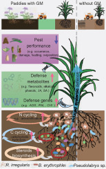 ecological pest management (epm) is gaining increased attention with concerns regarding human health and the environment. planting green manure (gm) represents a significant practice in epm; meanwhile, gm enhances crop production and reduces environmental footprints via its effect on the soil microbiome. gm's direct inhibitory effect on pests and its protective effect on natural enemies have been widely reported. however, the impact of gm's soil legacy effect on pests and the underlying molecular mechanisms remains poorly characterized. in this study, three-year field trials, greenhouse experiments, and multi-omics integration were conducted to address the gap. compared to winter fallow treatment, gm significantly reduced the occurrence of rice major pests by 43.8–94.2 %, including mythimna separata, cnaphalocrocis medinalis, chilo suppressalis, and rice planthoppers. the infestation rate of c. suppressalis, consumption by m. separata, and oviposition by nilaparvata lugens were reduced by 64.3–87.4 %, 38.7–39.9 % and 45.3 %, respectively. mechanistically, gm upregulated key defense-related genes and stimulated biosynthesis of flavonoids and alkaloids, alongside the accumulation of jasmonic acid and salicylic acid, indicating synergistic activation of induced systemic resistance in rice plants. rhizosphere soil analysis revealed gm-driven enrichment of plant-beneficial taxa (rhizophagus irregularis, bradyrhizobium erythrophlei, pseudolabrys sp.), alongside enhanced soil multifunctionality (n/c cycling) and nutrient mobilization. our pls-pm results supported a scenario in which gm-induced pest suppression is potentially mediated by microbiome-driven defense priming. our findings provide fundamental insights into epm and highlight how gm modulates the rhizosphere ecosystem and further enhances aboveground systemic resistance in rice. this study offers a potential solution for reducing synthetic inputs in crop production, which contributes to agroecosystem sustainability.