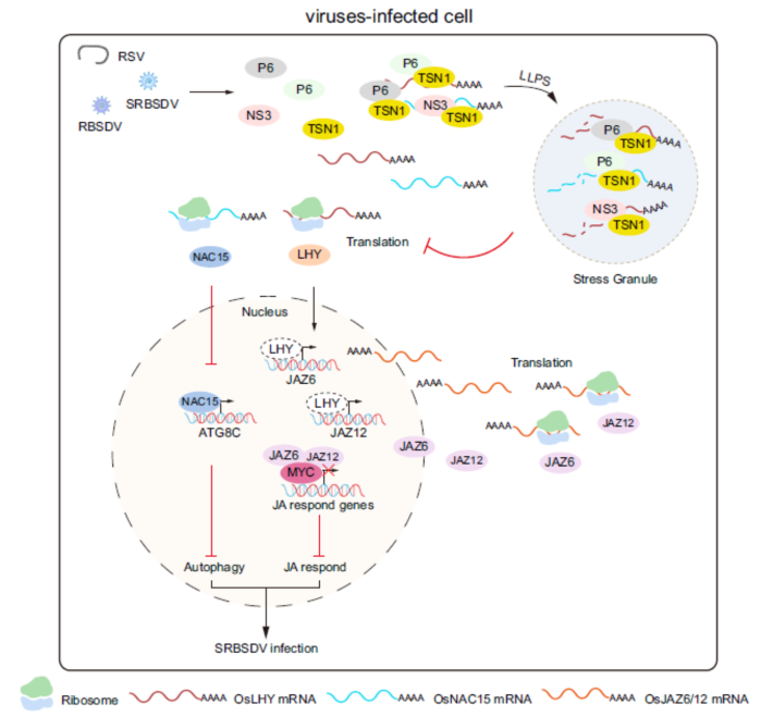 论文共同通讯作者、中国农业科学院植物保护研究所教授周雪平介绍,c合蛋白ostsn1被劫持进入液滴。研究发现,这些液滴精准锚定于细胞的应激颗粒中,而ostsn1蛋白是液滴定位的关键“导航仪”。