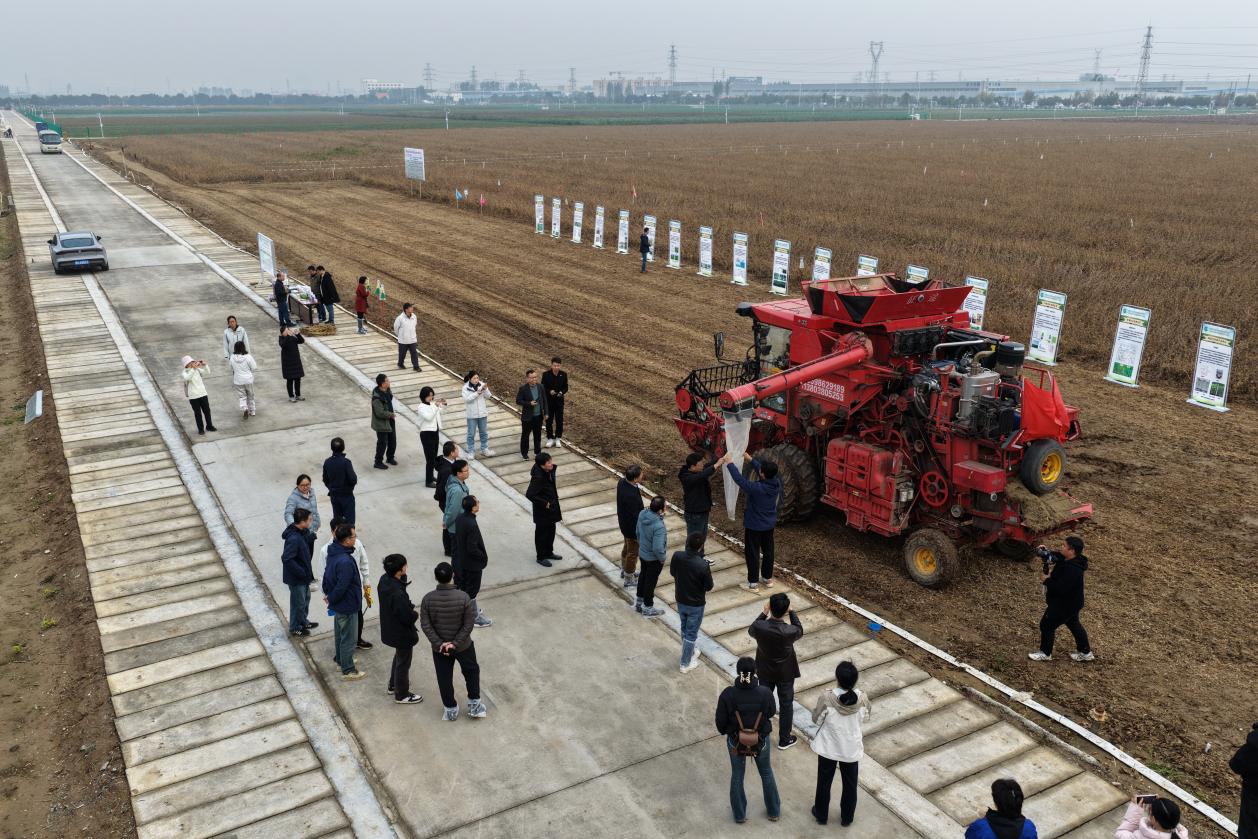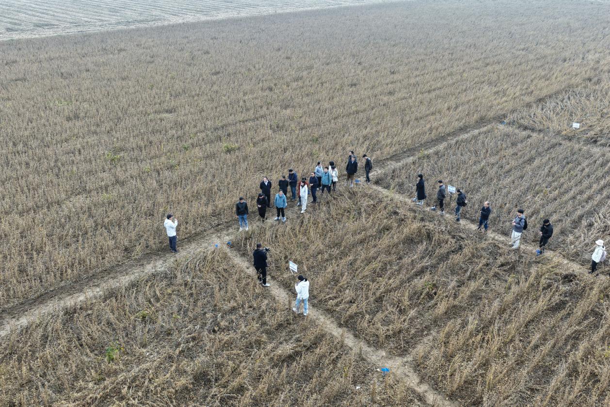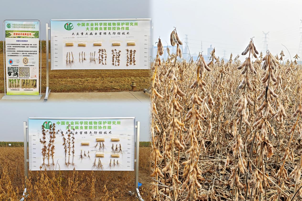 观摩现场,新乡试验基地集中展示了包括阿泰灵、福莱菌肽、泽纳菌肽、链霉菌、木霉、放线菌、药种同播缓释剂、bt可湿性粉剂g033a等在内的多种我所自研新产品在大豆上的控病提质增产效果;展示了抗病新品种在黄淮海地区的品种适应性;同时展出了“阿泰灵-福莱菌肽”全程防控、免耕直播与秸秆还田、土壤封闭除草、害虫性诱监测与无人机飞防、生物与化学农药“一喷多促”等关键技术。通过集成创新,科研团队完善了“一包四喷”绿色防控技术模式,在2025年河南秋季气候条件不利的情况下,有效保障了大豆稳产高产。经专家组现场实收实测,该技术体系核心示范区亩产达263公斤,病虫草害综合防效超过85%,增产效果显著,“阿泰灵-福莱菌肽”全程防控单项技术增产8%,展现出良好的适用性与推广前景。