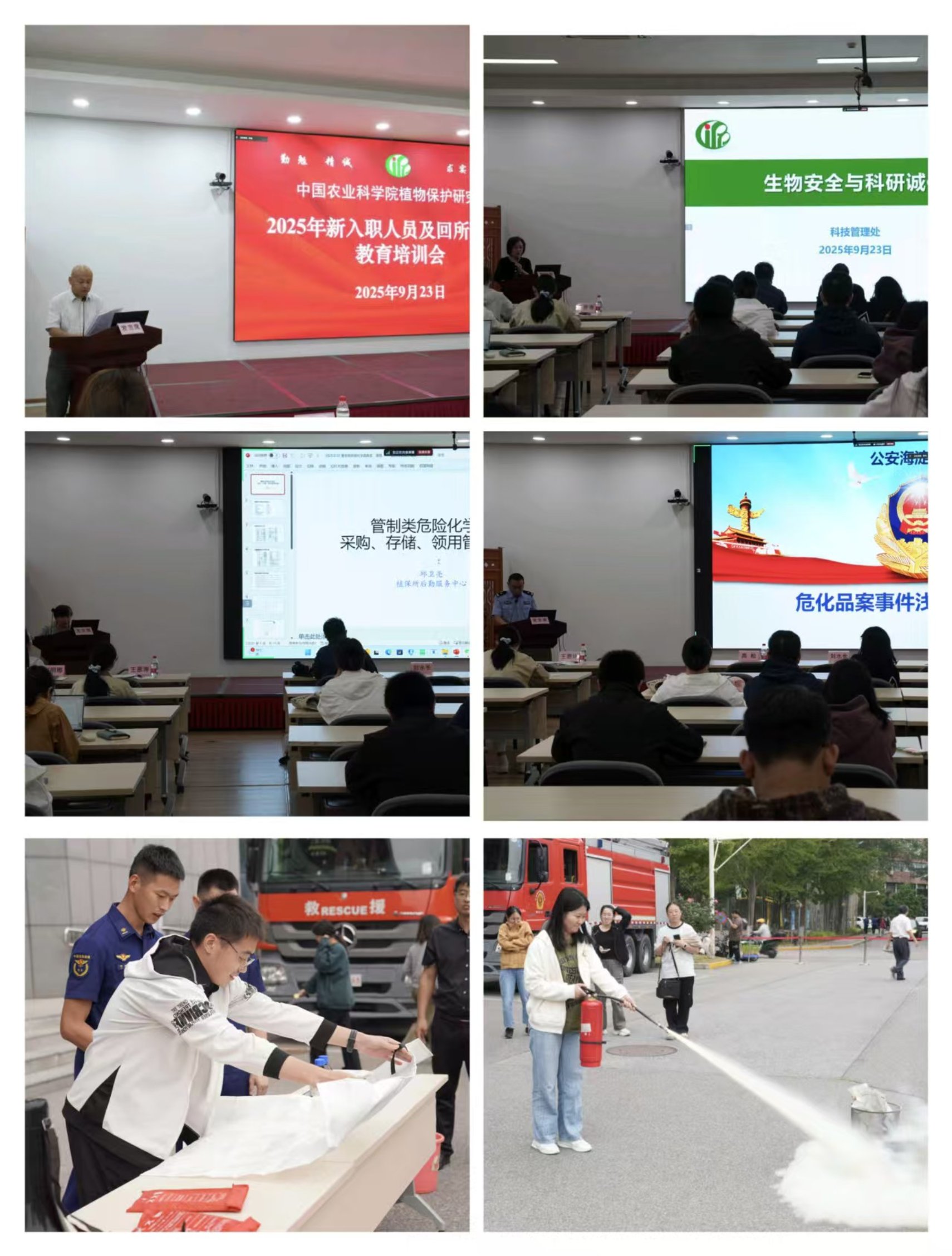 培训会安排了多项专题宣讲。所纪委委员刘太国研究员以“严守底线红线,争做’四有’新 农人”为题进行了集体谈话,勉励大家要做政治上的明白人、新时代的“四有”高知人、“会过日子”的勤俭人、“一懂两爱”的传承人和受欢迎的有爱人。科技管理作处解晓平老师以“生物安全与科研诚信”为题,介绍了生物安全国际动态和《生物安全法》的主要内容,重点讲述了农业生物安全科研活动及安全防护,并警示大家要树立诚信意识,恪守学术道德。仪器设备共享管理平台佟南老师介绍了仪器平台的基本情况,重点讲解了仪器预约、使用规范等注意事项。所后勤服务部、鼎元汇丰环保技术有限公司、马连洼派出所、海淀分局治安支队、圆明园消防救援站等单位的专家,分别就“管制类危险化学品采购、存储、领用管理制度”“危险废弃物规范化管理”“防范电信网络诈骗”“危险化学品管理与实验室安全”“消防安全与火灾应急”等内容进行了讲解。会后,组织进行了危废物处理与消防安全实操演练,进一步提升新入职人员和回所研究生的应急处置实战能力。