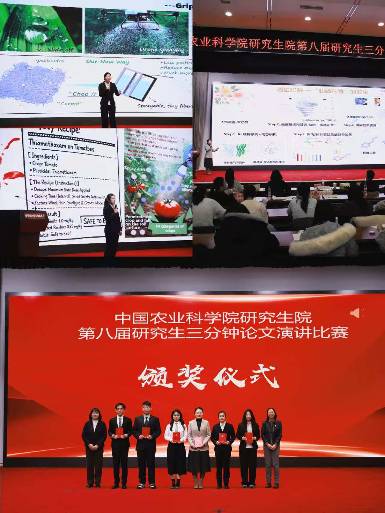 比赛中,植保所参赛研究生结合自己的研究课题,采取中文或英文演讲的形式,充分展现了植保所学子扎实深厚的学术素养和蓬勃向上的精神风貌,赢得现场阵阵掌声。经过激烈角逐,2024级博士研究生张语桐、2024级联合培养硕士研究生宋欣宇、2024级硕士研究生贾蕙榕分别凭借《幼虫陷阱—“超级花香”的诞生》《non-slip nanofiber shoes for pesticides》《the safety recipe for your salad》的演讲作品荣获二等奖。